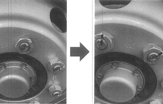ホイールナットの緩みは点検ハンマーを使用して確認しているが、今回ハブナット、ハブボルトに直線を引き、線のズレで緩みが分かるようにしたことで、目視でも確認することができるようにした。